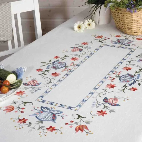 We embroider on the pre-printed base in the specified place with the color in the description. We use a flat stitch and a stem stitch when making the tablecloth.