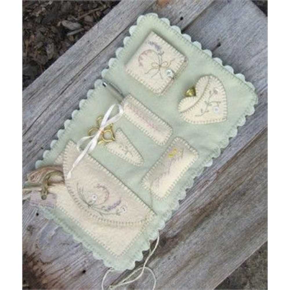 A hand embroidery and sewing pattern for a tri-fold organizer designed to store stitching tools and supplies.