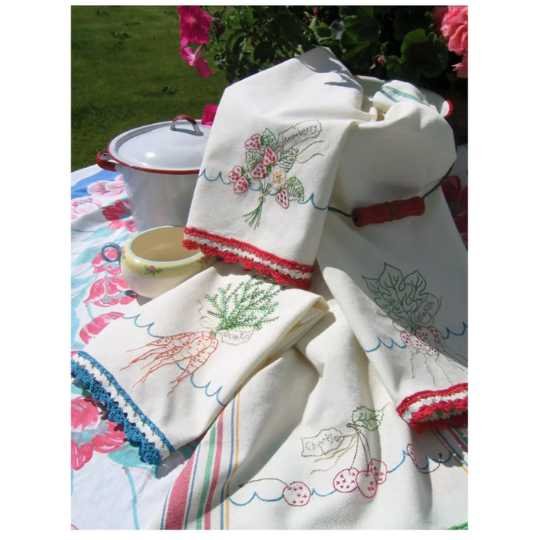 Four dish towel stitcheries just as ripe & juicy as your summer garden!