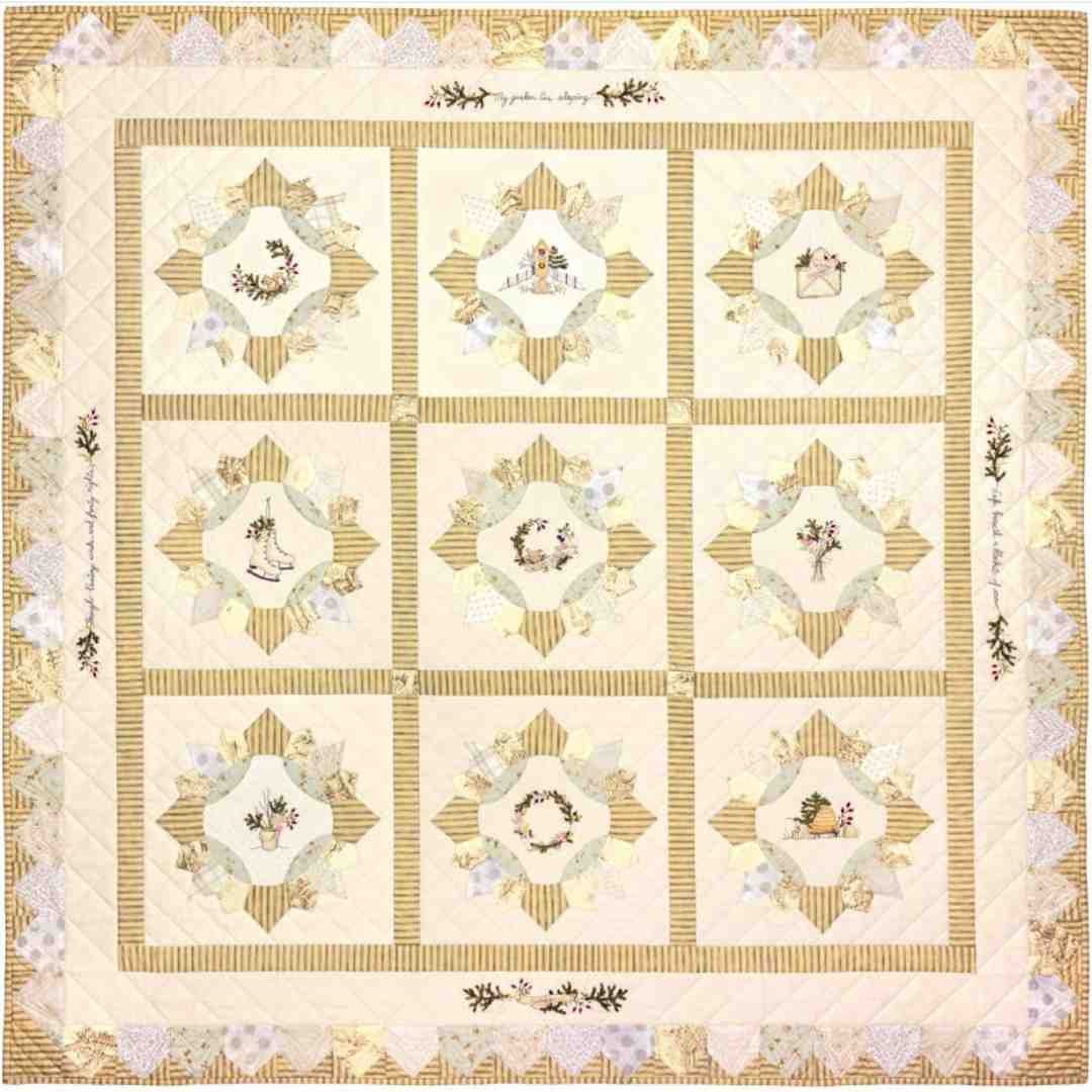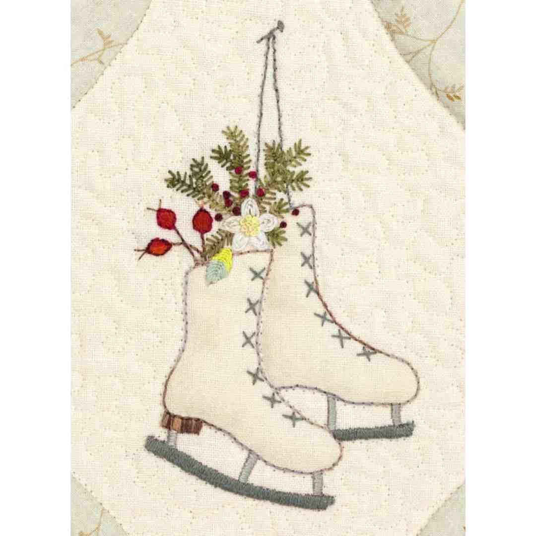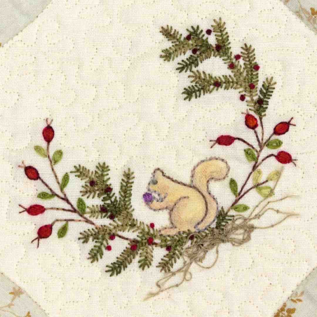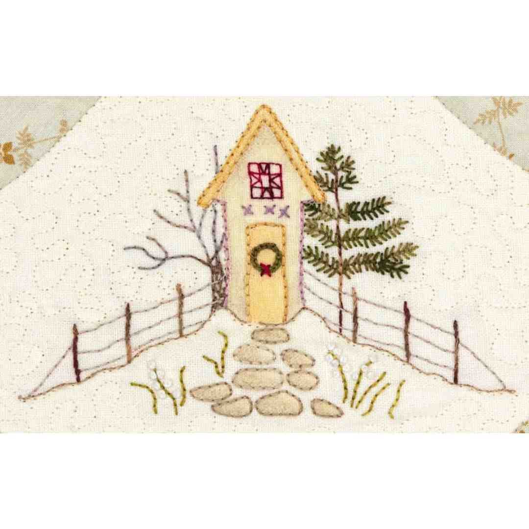 The sledding hill is buzzing with activity, but the farms and forests are quiet and still. Imagine yourself in the little church, warm inside the general store or cozy at home in one of the farmhouses. The embroidery is easy, using only one color of variegated floss… the piecing is deceptively simple with four blocks made in different sizes.