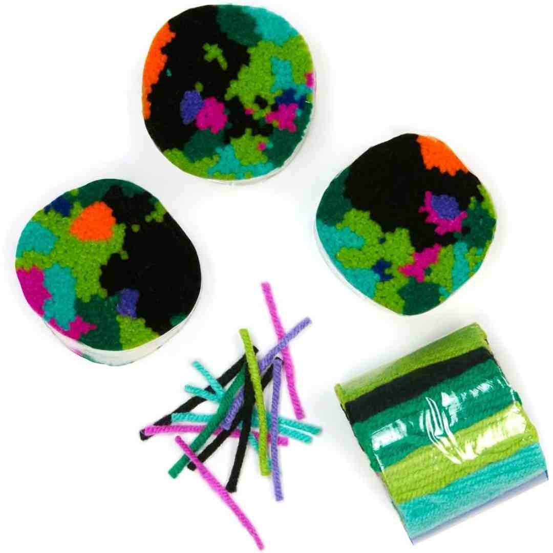 Finished kits can be made into pillows, wall hangings and more. The 16” x 16” kits feature cotton rug canvas with larger holes and a grid marked on the canvas. This makes it easier for beginners to learn the technique and allows for quicker projects.