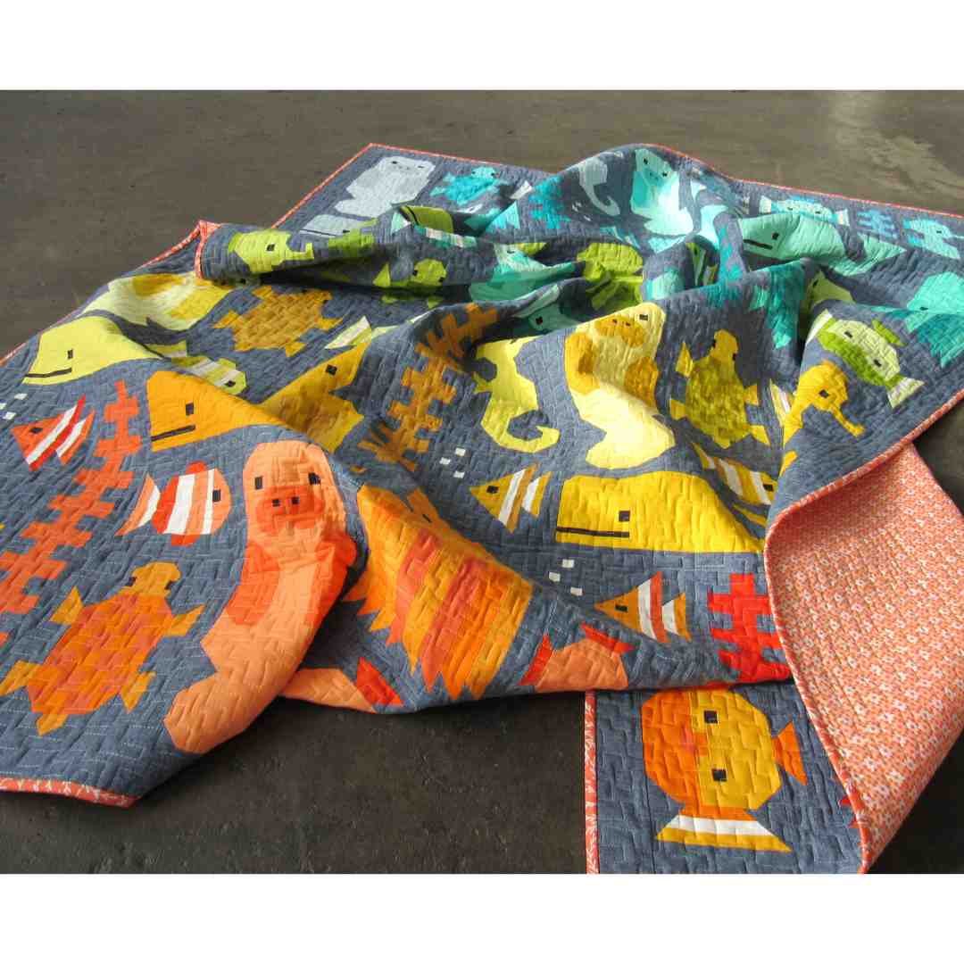 “The Awesome Ocean sea life sampler quilt features 8 brand-new blocks: Salty Seahorse, Octavian, Angelica, Tony the Turtle, Chuckles, Puffy, Mr. Manatee, and Kelp, as well as my popular Preppy the Whale. All blocks are sewn with simple straight and diagonal seams. No paper piecing!”