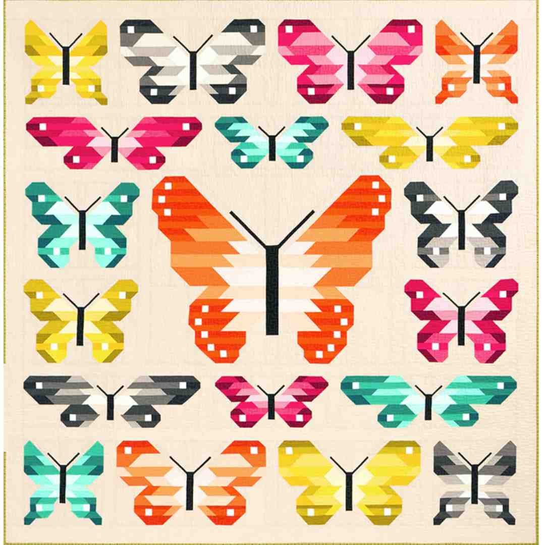 This is a large-format booklet pattern like Fancy Forest. It’s an 82″ x 82″ sampler with six different large-scale butterfly blocks. A 45″ x 45″ version with a single large butterfly is also included. Fat quarter friendly.