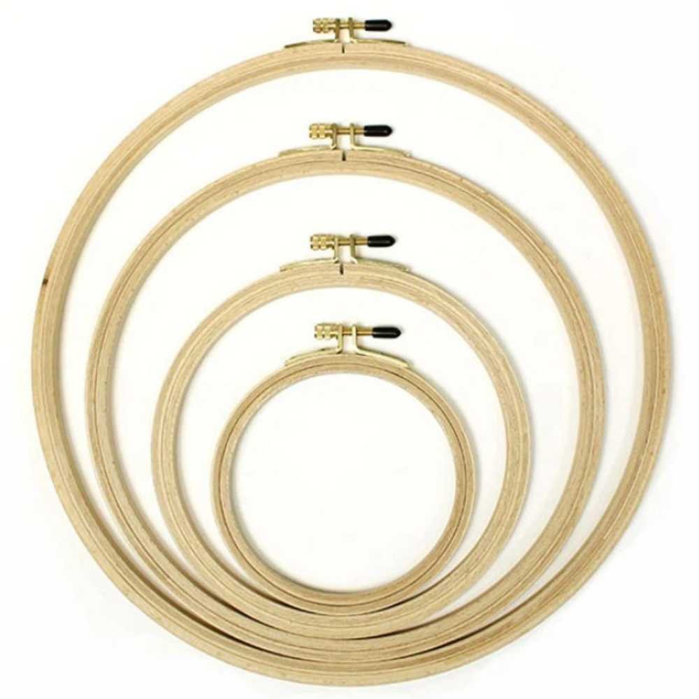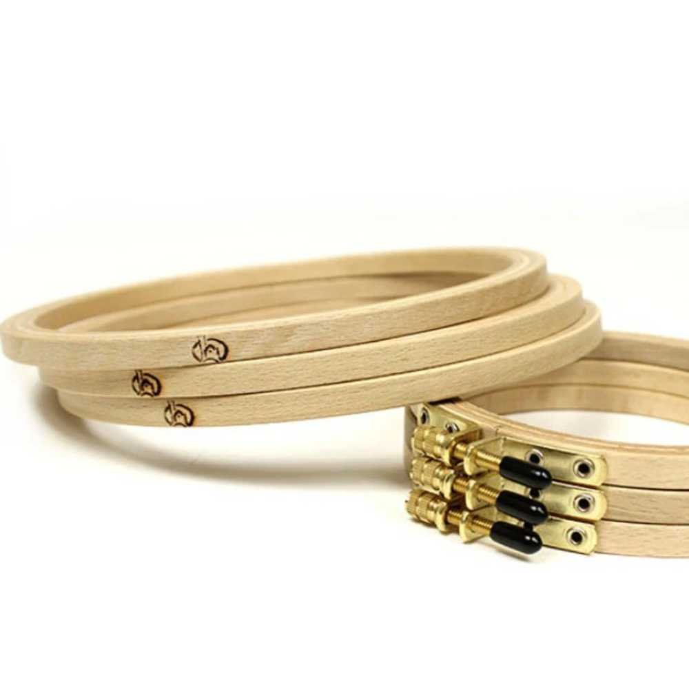 The embroidery rings are made of beechwood, triple glued, finely ground, varnished externally for protection and provided with a brass screw.