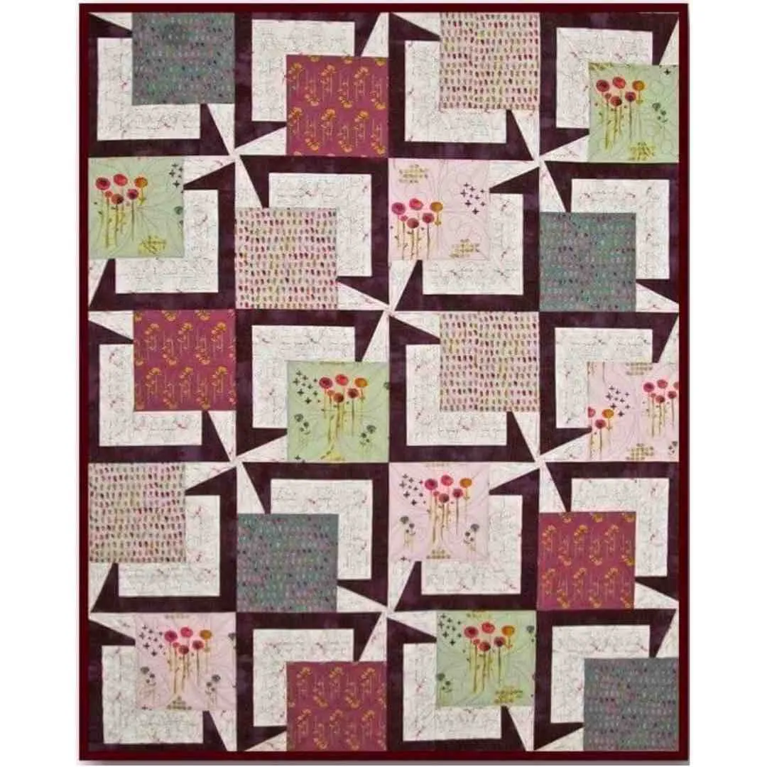 Big off center focus with a pinwheel or accent splash. The pinwheels are a flat top diagonal which doesn’t require matching of sharp points. Use one center fabric or many.