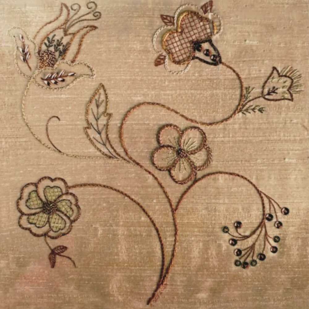 This is a simple Jacobean style design, ideal for a cushion, using metallic threads and beads