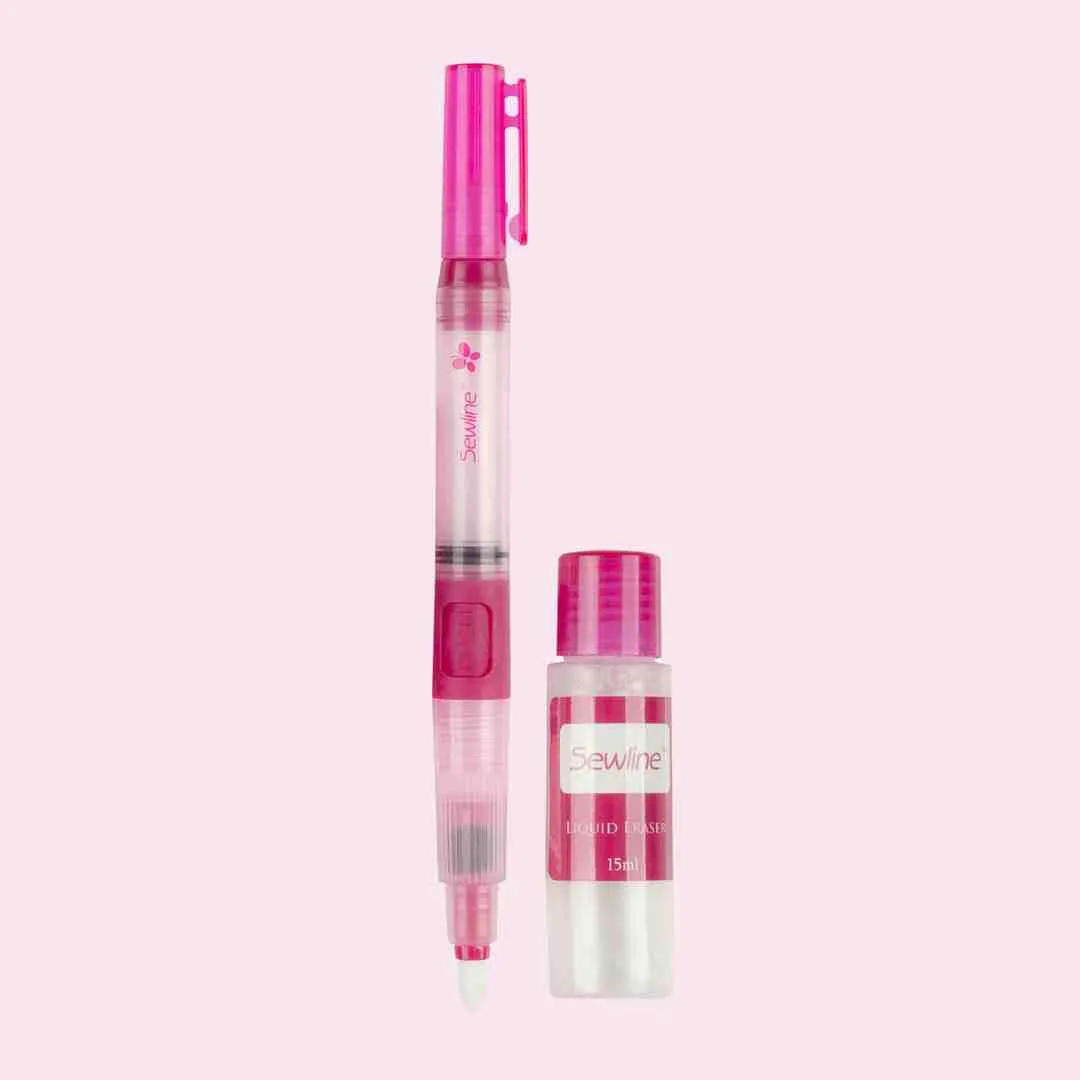 Getting those drafting lines from fabric has sometimes been a cause of concern when we wanted to get rid of the lines without hurting our fabric. Not any more with the new Sewline Aqua Eraser. It works rather like a fountain pen with a reservoir you simply fill with water or a water and detergent mix.