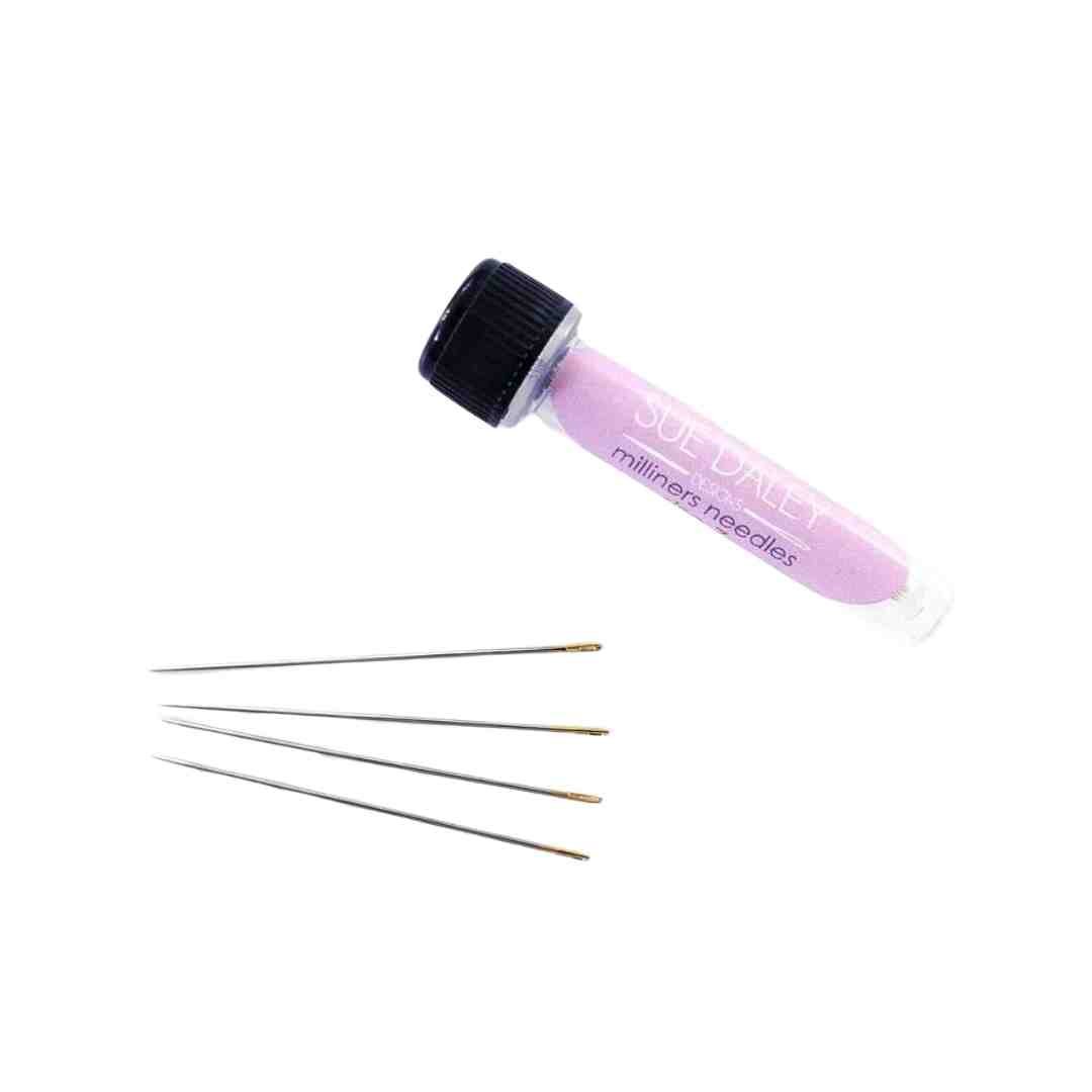Sue Daley Designs milliners/straw needles are long and fine with a nice big gold eye which makes it easier to thread. The larger the size number, the finer the needle.