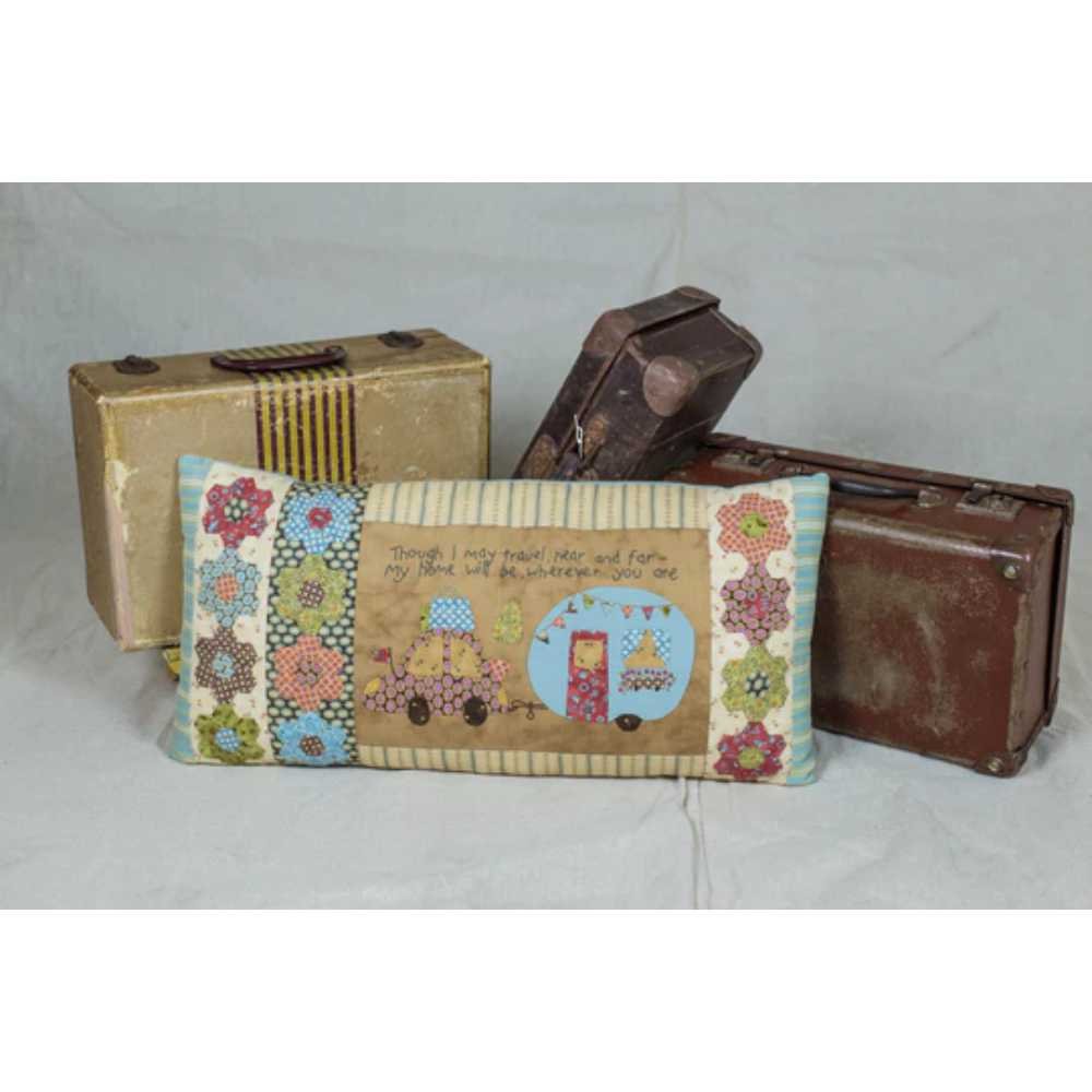 A long cushion featuring a car and caravan, with a sweet verse, English paper-pieced hexagons and simple construction.